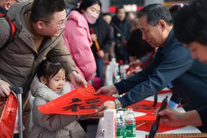 (260210) -- BEIJING, 10 febrero, 2026 (Xinhua) -- Una niña recibe el carácter chino "Fu" (que significa buena fortuna) de un calígrafo en la Estación del Ferrocarril del Oeste de Tianjin, en la municipalidad de Tianjin, en el norte de China, el 10 de febrero de 2026. Diversos tipos de actividades se llevaron a cabo el martes para celebrar el tradicional Festival de Xiaonian en el norte de China, que marca el inicio de la cuenta regresiva para el Fiesta de la Primavera. (Xinhua/Sun Fanyue) (jg) (ra) (vf)