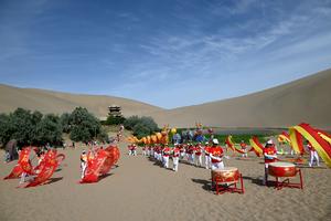 (250531) -- DUNHUANG, 31 mayo, 2025 (Xinhua) -- Un equipo de la danza del dragón realiza una presentación para turistas durante una celebración del Festival del Bote del Dragón en el área escénica de la Montaña Mingsha y el Manantial de la Luna Creciente, en Dunhuang, en la provincia de Gansu, en el noroeste de China, el 31 de mayo de 2025. El Festival del Bote del Dragón, también conocido como Festival Duanwu, es una fiesta tradicional china para conmemorar al antiguo poeta chino, Qu Yuan, del Período de los Reinos Combatientes (475-221 a.C.). Celebrado el quinto día del quinto mes del calendario lunar chino, el festival cae el 31 de mayo este año. (Xinhua/Zhang Xiaoliang) (oa) (da)
