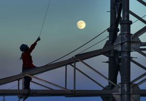 (251006) — BEIJING, 6 octubre, 2025 (Xinhua) — Imagen tomada con un dron el 6 de octubre de 2025 de un trabajador con la luna llena como telón de fondo, en Hengyang, en la provincia de Hunan, en el centro de China. El lunes se celebra el Festival del Medio Otoño de este año, que tiene lugar cada año el decimoquinto día del octavo mes del calendario lunar chino. Personas de toda China admiran la luna llena para celebrar esta festividad tradicional. (Xinhua/Cao Zhengping) (oa) (ah) (vf)