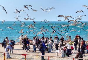 (250407) -- BEIJING, 7 abril, 2025 (Xinhua) -- Imagen tomada con un dron el 6 de abril de 2025 de turistas interactuando con gaviotas de cola negra en la costera de un parque de vida silvestre cerca de la aldea de Xixiakou, en la ciudad de Rongcheng, en la provincia de Shandong, en el este de China. China registró 126 millones de viajes internos durante los tres días de vacaciones del Festival Qingming que terminaron el domingo, lo que supone un aumento del 6,3 por ciento respecto al año previo, informó el lunes el Ministerio de Cultura y Turismo. Los ingresos por turismo alcanzaron los 57.550 millones de yuanes (unos 8.000 millones de dólares), lo que significa un incremento interanual del 6,7 por ciento. (Xinhua/Li Xinjun) (rtg) (ah) (vf)