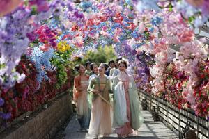 (250407) -- BEIJING, 7 abril, 2025 (Xinhua) -- Imagen del 6 de abril de 2025 de actrices portando trajes tradicionales mientras realizan una presentación para turistas, en la aldea artística de Zuidongfeng, en el distrito de Tancheng, en la provincia de Shandong, en el este de China. China registró 126 millones de viajes internos durante los tres días de vacaciones del Festival Qingming que terminaron el domingo, lo que supone un aumento del 6,3 por ciento respecto al año previo, informó el lunes el Ministerio de Cultura y Turismo. Los ingresos por turismo alcanzaron los 57.550 millones de yuanes (unos 8.000 millones de dólares), lo que significa un incremento interanual del 6,7 por ciento. (Xinhua/Zhang Chunlei) (rtg) (vf)