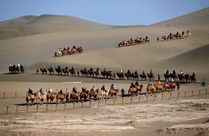 (250407) -- BEIJING, 7 abril, 2025 (Xinhua) -- Imagen del 5 de abril de 2025 de turistas disfrutando paseos en camello en el punto escénico de la Montaña Mingsha y el punto escénico del Manantial de la Luna Creciente, en Dunhuang, en la provincia de Gansu, en el noroeste de China. China registró 126 millones de viajes internos durante los tres días de vacaciones del Festival Qingming que terminaron el domingo, lo que supone un aumento del 6,3 por ciento respecto al año previo, informó el lunes el Ministerio de Cultura y Turismo. Los ingresos por turismo alcanzaron los 57.550 millones de yuanes (unos 8.000 millones de dólares), lo que significa un incremento interanual del 6,7 por ciento. (Xinhua/Zhang Xiaoliang) (rtg) (ah) (vf)