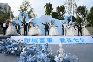 (250829) -- BEIJING, 29 agosto, 2025 (Xinhua) -- Parejas asisten a una boda grupal con motivo del Festival Qixi, en el distrito de Dongxing de la ciudad de Neijiang, en la provincia de Sichuan, en el suroeste de China, el 29 de agosto de 2025. Personas a lo largo del país festejaron el Festival Qixi o el Día de San Valentín chino el viernes. (Xinhua/Lan Zitao) (rtg) (ra) (vf)