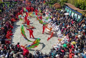 (260419) -- BEIJING, 19 abril, 2026 (Xinhua) -- Vista aérea tomada con un dron el 19 de abril de 2026 de aldeanos realizando una presentación en un evento en celebración del Festival Sanyuesan, en Taizhou, en la provincia de Jiangsu, en el este de China. El Festival Sanyuesan, es un festival tradicional celebrado el tercer día del tercer mes lunar por varios grupos étnicos en China, que este año cae el 19 de abril.(Xinhua/Tang Dehong) (oa) (da)