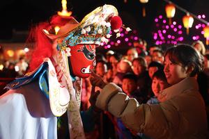 (250128) -- BEIJING, 28 enero, 2025 (Xinhua) -- Imagen del 26 de enero de 2025 de un intérprete de la Opera de Sichuan interactuando con los espectadores, en el distrito de Qianjiang, en la municipalidad de Chongqing, en el suroeste de China. China está viva con celebraciones vibrantes con la Fiesta de la Primavera a la vuelta de la esquina. (Xinhua/Yang Min) (jg) (ra) (ce)