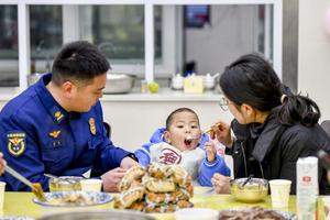 (250128) -- BEIJING, 28 enero, 2025 (Xinhua) -- Un bombero asiste a una comida de reunión con sus familiares en una estación de bomberos, en la ciudad de Taizhou, en la provincia de Jiangsu, en el este de China, el 28 de enero de 2025. Cenar con los miembros de la familia en una comida de reunión ha sido una tradición apreciada para los chinos la víspera de la Fiesta de la Primavera, que cae el 29 de enero este año. (Xinhua/Yang Yugang) (jg) (ra) (ce)