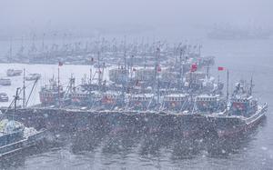 (250207) -- BEIJING, 7 febrero, 2025 (Xinhua) -- Imagen tomada con un dron de botes pesqueros atracando en un puerto en medio de una nevada, en la ciudad de Rongcheng, en la provincia de Shandong, en el este de China, el 7 de febrero de 2025. El Centro Meteorológico Nacional de China renovó el viernes una alerta amarilla por fuertes vientos. La entidad también renovó una alerta azul por ola de frío, advirtiendo que desde el viernes hasta el sábado se espera que esta ola se sienta en el país, causando descensos de la temperatura en partes de las regiones noroeste y norte, la región de Huanghuai, la mayor parte de la región sur, la meseta de Qinghai-Xizang y la meseta occidental de Sichuan. En algunas de ellas, los descensos podrían superar los 10 grados centígrados. (Xinhua/Li Xinjun) (oa) (ra) (vf)