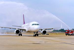 (251026) — FUZHOU, 26 octubre, 2025 (Xinhua) — Un avión partiendo hacia Phnom Penh, capital de Camboya, recibe un saludo de agua al aterrizar en el Aeropuerto Internacional Changle de Fuzhou, en Fuzhou, en la provincia de Fujian, en el sureste de China, el 26 de octubre de 2025. El primer vuelo de Fujian que obtuvo la Quinta Libertad del Aire, la ruta «Phnom Penh-Fuzhou-Tokio», fue oficialmente lanzada el domingo. La Quinta Libertad del Aire se refiere al derecho otorgado a una aerolínea de un país de hacer escala en un tercer país mientras opera una ruta internacional, lo que le permite cargar y descargar allí pasajeros y carga. (Xinhua/Lin Shanchuan) (rtg) (ah)
