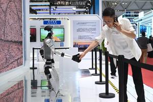 (250428) -- FUZHOU, 28 abril, 2025 (Xinhua) -- Un visitante interactúa con un robot humanoide en la zona de experiencias de la VIII Cumbre China Digital, en Fuzhou, en la provincia de Fujian, en el sureste de China, el 28 de abril de 2025. Con la asistencia de más de 300 instituciones profesionales, la VIII Cumbre China Digital abrió su zona de experiencias a los visitantes profesionales el lunes, mostrando los logros de la transformación digital del país en medio de un sólido crecimiento en el sector digital. (Xinhua/Lin Shanchuan) (rtg) (ah) (ce)