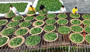 (250520) -- WUYISHAN, 20 mayo, 2025 (Xinhua) -- Imagen del 2 de mayo de 2025 de Liu Feng (2-d), un heredero de la técnica de elaboración del té de roca Wuyi, aireando hojas de té con agricultores, en Wuyishan, en la provincia de Fujian, en el sureste de China. Wuyishan, una importante base productora de té en China, es el hogar del famoso té de roca Wuyi, un tipo de té oolong. Su técnica de elaboración del té fue declarada patrimonio cultural inmaterial nacional en 2006 y forma parte de las "técnicas tradicionales de elaboración del té y prácticas sociales asociadas en China" inscritas en 2022 como patrimonio cultural inmaterial de la UNESCO. (Xinhua/Qiu Ruquan) (oa) (ah) (vf)