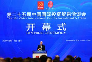 (250908) -- XIAMEN, 8 septiembre, 2025 (Xinhua) -- Peter Wilson, embajador de Reino Unido en China, lee una carta de felicitación del primer ministro británico, Keir Starmer, en la ceremonia de apertura de la 25ª Feria Internacional para la Inversión y el Comercio de China (CIFIT, siglas en inglés), en Xiamen, en la provincia de Fujian, en el sureste de China, el 8 de septiembre de 2025. La 25ª CIFIT se inauguró aquí el lunes, atrayendo a visitantes provenientes de más de 120 países y regiones. (Xinhua/Wei Peiquan) (rtg) (ah) (ce)