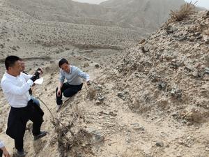 (250429) — LANZHOU, 29 abril, 2025 (Xinhua) — Imagen del 19 de abril de 2025 de un equipo de investigación arqueológica estudiando una sección de la Gran Muralla, en el distrito de Jingyuan en la ciudad de Baiyin, en la provincia de Gansu, en el noroeste de China. Nueve secciones de la Gran Muralla, que se cree que datan de hace más de 2000 años, han sido descubiertas en la provincia de Gansu, en el noroeste de China, de acuerdo con arqueólogos locales. Fueron halladas en el distrito de Jingyuan, en la ciudad de Baiyin, y basándose en características como el grosor de las capas de tierra apisonada, los arqueólogos inicialmente concluyeron que las paredes fueron construidas durante la dinastía Qin (221 a. C.-207 a. C.). (Xinhua) (jg) (ra) (vf)
