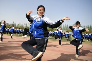 (251104) — LANZHOU, 4 noviembre, 2025 (Xinhua) — Imagen del 26 de abril de 2023 de estudiantes practicando calistenia incorporando la danza de Dunhuang durante un recreo en la Escuela Secundaria de Dunhuang, en Dunhuang, en la provincia de Gansu, en el noroeste de China. La danza Dunhuang se refiere a un estilo de danza que tiene como objetivo dar vida a las figuras icónicas representadas en los antiguos murales de las Grutas de Mogao. Inspirándose en temas históricos, artistas contemporáneos han creado obras maestras de música y danza, como el clásico drama de danza «Flores Llueven a lo largo de la Ruta de la Seda», y «Bodhisattva de las Mil Manos». (Xinhua/Chen Bin) (jg) (ra) (ce)