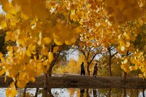 (251015) -- DUNHUANG, 15 octubre, 2025 (Xinhua) -- Imagen del 14 de octubre de 2025 de turistas disfrutando del paisaje en un bosque de Populus euphratica, en la ciudad de Dunhuang, en la provincia de Gansu, en el noroeste de China. (Xinhua/Zhang Xiaoliang) (jg) (da) (ce)
