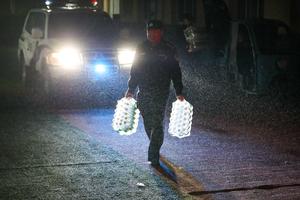 (250928) -- LONGXI, 28 septiembre, 2025 (Xinhua) -- Imagen del 27 de septiembre de 2025 de un policía cargando suministros de apoyo por el sismo en un albergue temporal, en la aldea de Xianjiamen, en el poblado de Wenfeng del distrito de Longxi, en la provincia de Gansu, en el noroeste de China. Un sismo de magnitud 5,6 sacudió el distrito de Longxi, en la ciudad de Dingxi, a las 05:49 del sábado. Tras el terremoto, las fuerzas de rescate, incluidos bomberos, policías y médicos, realizaron labores de socorro en las zonas afectadas por el terremoto. (Xinhua/Lang Bingbing) (rtg) (ah)