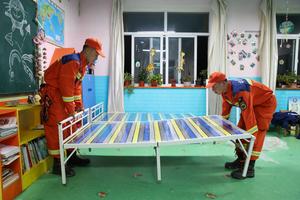 (250928) -- LONGXI, 28 septiembre, 2025 (Xinhua) -- Imagen del 27 de septiembre de 2025 de rescatistas colocando camas en un albergue temporal, en la aldea de Xianjiamen, en el poblado de Wenfeng del distrito de Longxi, en la provincia de Gansu, en el noroeste de China. Un sismo de magnitud 5,6 sacudió el distrito de Longxi, en la ciudad de Dingxi, a las 05:49 del sábado. Tras el terremoto, las fuerzas de rescate, incluidos bomberos, policías y médicos, realizaron labores de socorro en las zonas afectadas por el terremoto. (Xinhua/Lang Bingbing) (rtg) (ah)