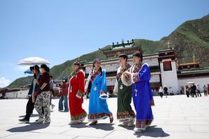 (250711) -- XIAHE, 11 julio, 2025 (Xinhua) -- Imagen del 10 de julio de 2025 de turistas visitando el Monasterio de Labrang, en el distrito de Xiahe de la prefectura autónoma tibetana de Gannan, en la provincia de Gansu, en el noroeste de China. Tras años de renovación, la protección y restauración de las pinturas al óleo de la estructura de madera del Monasterio de Labrang, que sirve como una institución educativa de budismo tibetano de primer nivel en China, está cerca de completarse. (Xinhua/Chen Bin) (rtg) (ra) (ce)
