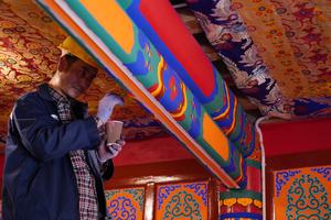 (250711) -- XIAHE, 11 julio, 2025 (Xinhua) -- Imagen del 10 de julio de 2025 de un trabajador reparando las pinturas al óleo de la estructura de madera del Monasterio de Labrang, en el distrito de Xiahe de la prefectura autónoma tibetana de Gannan, en la provincia de Gansu, en el noroeste de China. Tras años de renovación, la protección y restauración de las pinturas al óleo de la estructura de madera del Monasterio de Labrang, que sirve como una institución educativa de budismo tibetano de primer nivel en China, está cerca de completarse. (Xinhua/Ma Ning) (rtg) (ra) (ce)