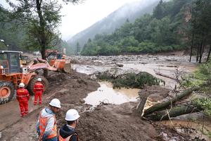 (250808) -- YUZHONG, 8 agosto, 2025 (Xinhua) -- Rescatistas trabajan para restaurar una carretera bloqueada después de los torrentes de montaña, en el poblado de Mapo, en el distrito de Yuzhong de la provincia de Gansu, en el noroeste de China, el 8 de agosto de 2025. Las labores de rescate continúan en marcha luego de que lluvias fuertes y continuas provocaran torrentes de montaña en el distrito de Yuzhong, ubicado en la provincia noroccidental china de Gansu, dejando diez personas muertas y 33 desaparecidas. (Xinhua/Jin Wangui) (rtg) (ra) (vf)