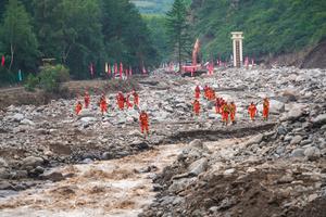 (250810) -- YUZHONG, 10 agosto, 2025 (Xinhua) -- Rescatistas buscan personas desaparecidas en la aldea de Xinglongshan, en el distrito de Yuzhong, en la provincia de Gansu, en el noroeste de China, el 10 de agosto de 2025. Las carreteras dañadas por los torrentes de montaña en el distrito de Yuzhong, en la provincia noroccidental china de Gansu, se reabrieron el domingo, a la vez que se restableció el suministro eléctrico tras el desastre que provocó 13 muertos y 30 desaparecidos. Los esfuerzos de búsqueda y rescate de los desaparecidos se encuentran en marcha. (Xinhua/Bai Qiyuan) (rtg) (da)
