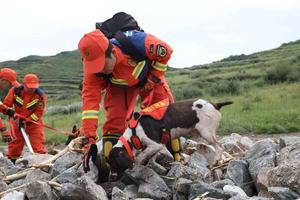 (250810) -- YUZHONG, 10 agosto, 2025 (Xinhua) -- Un rescatista y su perro olfateador buscan personas desaparecidas, en la aldea de Maliantan, en el distrito de Yuzhong, en la provincia de Gansu, en el noroeste de China, el 10 de agosto de 2025. Las carreteras dañadas por los torrentes de montaña en el distrito de Yuzhong, en la provincia noroccidental china de Gansu, se reabrieron el domingo, a la vez que se restableció el suministro eléctrico tras el desastre que provocó 13 muertos y 30 desaparecidos. Los esfuerzos de búsqueda y rescate de los desaparecidos se encuentran en marcha. (Xinhua/Departamento de Bomberos y Rescate de Gansu) (rtg) (da)