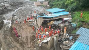 (250810) -- YUZHONG,10 agosto, 2025 (Xinhua) -- Imagen tomada con un dron el 10 de agosto de 2025 de rescatistas buscando personas desaparecidas, en la aldea de Jiuzhuanggou, en el distrito de Yuzhong, en la provincia de Gansu, en el noroeste de China. Las carreteras dañadas por los torrentes de montaña en el distrito de Yuzhong, en la provincia noroccidental china de Gansu, se reabrieron el domingo, a la vez que se restableció el suministro eléctrico tras el desastre que provocó 13 muertos y 30 desaparecidos. Los esfuerzos de búsqueda y rescate de los desaparecidos se encuentran en marcha. (Xinhua/Dang Ruilin) (rtg) (da)