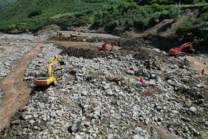 (250812) -- YUZHONG, 12 agosto, 2025 (Xinhua) -- Imagen tomada con un dron el 11 de agosto de 2025 de rescatistas retirando rocas tras las inundaciones repentinas, en la aldea de Yangwashan, en el distrito de Yuzhong, en la provincia de Gansu, en el noroeste de China. Las carreteras dañadas por los torrentes de montaña en el distrito de Yuzhong, reabrieron el domingo, a la vez que se restableció el suministro eléctrico tras el desastre que provocó 13 muertos y 30 desaparecidos. (Xinhua/Fan Peishen) (oa) (ah) (vf)