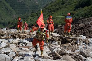 (250812) -- YUZHONG, 12 agosto, 2025 (Xinhua) -- Imagen del 11 de agosto de 2025 de rescatistas realizando operaciones de búsqueda, en la aldea de Yangwashan, en el distrito de Yuzhong, en la provincia de Gansu, en el noroeste de China. Las carreteras dañadas por los torrentes de montaña en el distrito de Yuzhong, reabrieron el domingo, a la vez que se restableció el suministro eléctrico tras el desastre que provocó 13 muertos y 30 desaparecidos. (Xinhua/Fan Peishen) (oa) (ah) (vf)