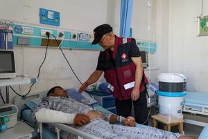 (250811) -- YUZHONG, 11 agosto, 2025 (Xinhua) -- Han Hao (d), un experto del equipo de tratamiento médico y subdirector del departamento de emergencia del segundo hospital popular de la provincia de Gansu, diagnostica a una persona herida en el primer hospital popular del distrito de Yuzhong, en Yuzhong, en la ciudad de Lanzhou, en la provincia de Gansu, en el noroeste de China, el 11 de agosto de 2025. Desde que se produjeron los torrentes de montaña en el distrito de Yuzhong, el departamento provincial de Salud envió a 26 expertos médicos al primer hospital popular del distrito para supervisar el tratamiento de los heridos. Actualmente, los 15 heridos, que han sido trasladados a hospitales provinciales y del distrito para recibir tratamiento, se encuentran fuera de peligro. (Xinhua/Lang Bingbing) (rtg) (ah)