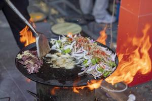 (250803) — ZHANGYE, 3 agosto, 2025 (Xinhua) — Imagen del 2 de agosto de 2025 de un cocinero preparando Chaobola, una comida callejera enlistada como patrimonio cultural inmaterial a nivel municipal, en un festival de comida, en Zhangye, en la provincia de Gansu, en el noroeste de China. (Xinhua/Feng Li) (rtg) (ah)