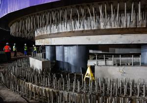 (251010) — JIANGMEN, 10 octubre, 2025 (Xinhua) — Constructores inspeccionan los cimientos de un puente giratorio a lo largo del Ferrocarril de Alta Velocidad Shenzhen-Jiangmen, en la provincia de Guangdong, en el sur de China, el 10 de octubre de 2025. El puente de 11.216 toneladas que se extiende 160 metros sobre una línea ferroviaria de mercancías fue rotada con éxito a la posición prevista el viernes por la mañana. (Xinhua/Liu Dawei) (oa) (ra) (vf)