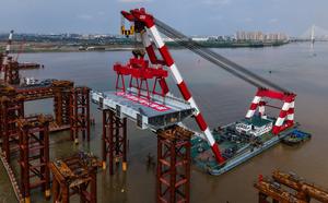 CHINA-GUANGDONG-GRAN PUENTE WANLONG-PRIMERA VIGA CAJON DE ACERO-COLOCACION