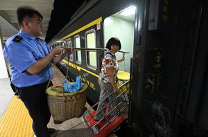 (250711) -- NANNING, 11 julio, 2025 (Xinhua) -- Imagen del 9 de julio de 2025 de un trabajador ferroviario (i) ayudando a una fruticultora a subir sus cestas a un tren en la Estación de Luchuan del Ferrocarril Litang-Zhanjiang, en la región autónoma de la etnia zhuang de Guangxi, en sur de China. Los trenes pintados de verde que circulan por el Ferrocarril Litang-Zhanjiang ofrecen un viaje muy rentable a los fruticultores. (Xinhua/Lu Boan) (oa) (ra) (vf)