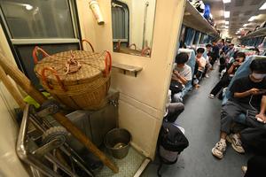 (250711) -- NANNING, 11 julio, 2025 (Xinhua) -- Imagen del 9 de julio de 2025 de cestas con postes y un carrito vistos en un tren con destino a la ciudad de Zhanjiang de la provincia de Guangdong, en el sur de China, desde la ciudad de Nanning de la región autónoma de la etnia zhuang de Guangxi, en sur de China. Los trenes pintados de verde que circulan por el Ferrocarril Litang-Zhanjiang ofrecen un viaje muy rentable a los fruticultores. (Xinhua/Lu Boan) (oa) (ra) (vf)