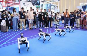 (250416) -- GUANGZHOU, 16 abril, 2025 (Xinhua) -- Imagen del 15 de abril de 2025 de compradores observando las presentaciones de los perros robots en la Zona de Robots de Servicio durante la 137 edición de la Feria de Importación y Exportación de China, también conocida como la Feria de Cantón, en Guangzhou, en la provincia de Guangdong, en el sur de China. La 137 edición de la Feria de Cantón, se inauguró el martes, con el número de expositores de exportación superando los 30.000 por primera vez en la historia de este famoso evento. La primera fase de la Feria de Cantón, celebrada del 15 al 19 de abril, se centró en la fabricación avanzada y por primera vez agregó una zona especial para robots de servicio, mostrando los últimos logros de los esfuerzos de desarrollo de la inteligencia artificial de China. (Xinhua/Lu Hanxin) (ah) (ra) (ce)
