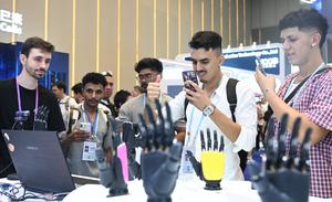 (251016) — GUANGZHOU, 16 octubre, 2025 (Xinhua) — Imagen del 15 de octubre de 2025 de compradores extranjeros interactuando con manos robóticas en la Zona de Robots de Servicio durante la 138ª edición de la Feria de Importación y Exportación de China (Feria de Cantón), en Guangzhou, en la provincia de Guangdong, en el sur de China. La feria destaca la Zona de Robots de Servicio para mostrar innovaciones de vanguardia, como robots humanoides, robots exoesqueleto, robots de patrullaje esféricos, robots de limpieza fotovoltaicos, robots educativos, etc. (Xinhua/Deng Hua) (rtg) (ra) (vf)