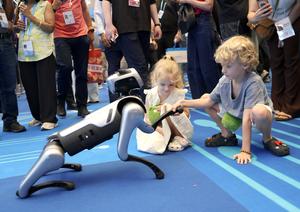 (260417) -- GUANGZHOU, 17 abril, 2026 (Xinhua) -- Imagen del 15 de abril de 2026 de un niño estrechando la mano de un perro robot en la edición número 139 de la Feria de Importación y Exportación de China, en Guangzhou, en la provincia de Guangdong, en el sur de China. La edición número 139 de la Feria de Importación y Exportación de China, también conocida como la Feria de Cantón, se inauguró aquí el miércoles. En el evento se ha habilitado un área de exposición para robots de servicio, que reúne a 46 empresas para mostrar las innovaciones tecnológicas y las capacidades de aplicación del sector de los robots de servicio de China. (Xinhua/Lu Hanxin) (oa) (ra) (vf)