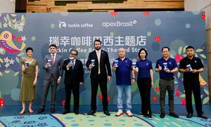 (250916) -- GUANGZHOU, 16 septiembre, 2025 (Xinhua) -- Imagen del 15 de septiembre de 2025 de la ceremonia de inauguración de la primera cafetería temática brasileña abierta por Luckin Coffee, en la Gran Area de la Bahía de Guangdong-Hong Kong-Macao, en la ciudad de Guangzhou, en la provincia de Guangdong, en el sur de China. Luckin Coffee, una de las principales cadenas de café chinas, inauguró oficialmente su primera tienda temática de café brasileño el lunes. (Xinhua) (oa) (ah) (ce)