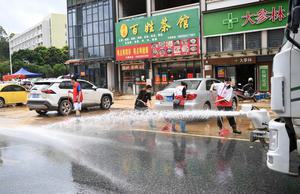 (250619) -- HUAIJI, 19 junio, 2025 (Xinhua) -- Voluntarios limpian una calle afectada por la inundación, en el distrito de Huaiji, en la provincia de Guangdong, en el sur de China, el 19 de junio de 2025. La Comisión Nacional de Desarrollo y Reforma de China informó que ha asignado 60 millones de yuanes (unos 8,36 millones de dólares) del presupuesto central para apoyar los esfuerzos de alivio de inundaciones en la provincia de Guangdong, en el sur del país. Hasta el mediodía del miércoles, fuertes y continuas precipitaciones habían afectado a aproximadamente 300.000 residentes del distrito de Huaiji, bajo administración de Zhaoqing, y cerca de 70.000 personas habían sido reubicadas a zonas seguras, de acuerdo con las autoridades locales. (Xinhua/Deng Hua) (jg) (da) (ce)