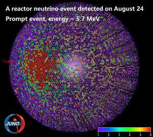 (250826) -- BEIJING, 26 agosto, 2025 (Xinhua) -- Imagen del 24 de agosto de 2025 de un diagrama esquemático de un evento de neutrinos de reactor detectado por el Observatorio Subterráneo de Neutrinos de Jiangmen (JUNO), en Jiangmen, en la provincia de Guangdong, en el sur de China. El detector esférico transparente más grande del mundo comenzó a operar el martes en China, convirtiéndose en la primera instalación científica ultragrande del mundo en funcionamiento dedicada a la investigación de neutrinos con precisión ultraalta. Tras completar el llenado de su detector de centelleo líquido de 20.000 toneladas, JUNO, en Guangdong, comenzó a recopilar datos tras más de una década de preparación y construcción. (Xinhua) (jg) (ra)