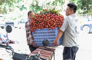(250607) -- MAOMING, 7 junio, 2025 (Xinhua) -- Imagen del 5 de junio de 2025 de agricultores transportando lichis recién cosechados, en la aldea de Baiqiao, en Gaozhou de la ciudad de Maoming, en la provincia de Guangdong, en el sur de China. Enclavada en los exuberantes paisajes del suroeste de la provincia de Guangdong, Gaozhou de la ciudad de Maoming es conocida como la "ciudad natal de los lichis" en China. Maoming es la mayor base de producción de lichi de China, con una superficie de plantación de aproximadamente 1,42 millones de mu (unas 94.667 hectáreas) y una producción anual que representó aproximadamente el 20 por ciento del total del país en 2024. Además de abastecer los mercados nacionales, el lichi de Maoming se exporta a todo el mundo, llegando a países como Rusia, Australia, Tailandia y Japón. (Xinhua/Mao Siqian) (jg) (da)
