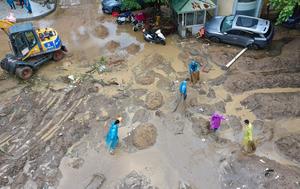 (250806) — ZHAOQING, 6 agosto, 2025 (Xinhua) — Vista aérea tomada con un dron el 6 de agosto de 2025 de trabajadores limpiando el limo, en el distrito de Dinghu de la ciudad de Zhaoqing, en la provincia de Guangdong, en el sur de China. La Comisión Nacional para la Prevención, la Reducción y el Alivio de Desastres de China activó el miércoles una respuesta de emergencia de nivel IV en la provincia meridional de Guangdong, debido a las fuertes lluvias y graves inundaciones, según el Ministerio de Gestión de Emergencias. (Xinhua/Xiao Ennan) (ah) (ra) (ce)