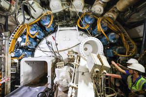 (250326) — SHANTOU, 26 marzo, 2025 (Xinhua) — Trabajadores de la construcción de China Railway 14th Bureau Group Co., Ltd. revisan la tuneladora de escudo «Yongping» con un diámetro de excavación de 14,57 metros, en la ciudad de Shantou, en la provincia de Guangdong, en el sur de China, el 26 de marzo de 2025. El túnel submarino de la Bahía de Shantou, el primer túnel submarino de un solo orificio y de doble vía del mundo con una velocidad diseñada de 350 kilómetros por hora, fue perforado el miércoles. El túnel de 9.781 metros de longitud es un proyecto del ferrocarril de alta velocidad Shantou-Shanwei. (Xinhua/Liu Dawei) (ah) (ra) (vf)
