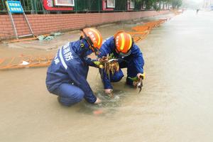 (250919) -- SHANWEI, 19 septiembre, 2025 (Xinhua) -- Rescatistas trabajan en una calle anegada, en Shanwei, en la provincia de Guangdong, en el sur de China, el 19 de septiembre de 2025. El tifón Mitag, el 17º de este año, tocó tierra en la provincia de Guangdong, en el sur de China, alrededor de las 14:50 del viernes, informó el observatorio meteorológico provincial. El fenómeno, con vientos de hasta 25 metros por segundo cerca de su centro, ingresó a la costa en la ciudad de Shanwei en Guangdong. (Xinhua) (rtg) (ra) (vf)