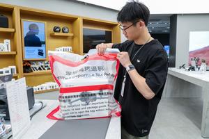 (250502) — SHENZHEN, 2 mayo, 2025 (Xinhua) — Imagen del 30 de abril de 2025 de un trabajador empaquetando un dron DJI en una bolsa sellada, en un centro comercial MixC, en Shenzhen, en la provincia de Guangdong, en el sur de China. Para agilizar aún más el proceso de reembolso de impuestos de salida para los viajeros extranjeros, Shenzhen lanzó un nuevo programa piloto con un modelo de «un pedido, una bolsa» en tres centros comerciales designados el 27 de abril. Con este sistema, las compras y los formularios de devolución de impuestos de salida se empaquetan juntos en bolsas selladas, lo que permite a los funcionarios de aduanas verificar rápidamente la autenticidad del embalaje y reducir el tiempo de inspección en más de un 50%. (Xinhua/Mao Siqian) (oa) (ra) (ce)