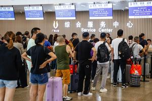 (250923) — GUANGZHOU, 23 septiembre, 2025 (Xinhua) — Pasajeros hacen fila para solicitar cambios y reembolsos de boletos en el centro de servicio de la Estación del Ferrocarril Sur de Guangzhou, en Guangzhou, en la provincia de Guangdong, en el sur de China, el 23 de septiembre de 2025. La provincia de Guangdong, en el sur de China, elevó al máximo su nivel de alerta por vientos a las 10:00 horas del martes, ya que se prevé que en las próximas 24 horas el tifón Ragasa toque tierra en las zonas costeras centrales u occidentales de la provincia como un tifón fuerte o un supertifón. (Xinhua/Liu Dawei) (jg) (ra) (ce)