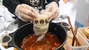 (250918) -- NANNING, 18 septiembre, 2025 (Xinhua) -- Imagen del 17 de septiembre de 2025 de un empleado preparando Luosifen en un puesto de la 22ª Exposición China-ASEAN, en Nanning, en la región autónoma de la etnia zhuang de Guangxi, en el sur de China. El Luosifen, o fideos de arroz con caracol de río, llamaron la atención y ganaron popularidad durante la 22ª Exposición China-ASEAN que se celebra actualmente. (Xinhua/Zhang Ailin) (jg) (ah) (vf)