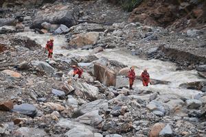 (250523) -- GUILIN, 23 mayo, 2025 (Xinhua) -- Rescatistas trabajan en el sitio de un torrente de montaña y un deslizamiento de tierra, en el distrito de Longsheng, en la región autónoma de la etnia zhuang de Guangxi, en el sur de China, el 23 de mayo de 2025. Se ha confirmado la muerte de tres personas y cinco permanecen desaparecidas luego de que un torrente de montaña y un deslizamiento de tierra afectaran en las primeras horas de la mañana del viernes una aldea de la región autónoma de la etnia zhuang de Guangxi, en el sur de China, según informaron las autoridades locales. (Xinhua/Huang Xiaobang) (jg) (da) (vf)