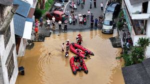 (250625) — LIUZHOU, 25 junio, 2025 (Xinhua) — Vista aérea tomada con un dron de rescatistas ayudando a residentes a cruzar el agua de la inundación, en el distrito de Rong’an, en la región autónoma de la etnia zhuang de Guangxi, en el sur de China, el 25 de junio de 2025. Las autoridades locales intensifican los esfuerzos de control de inundaciones y rescate luego de que días de lluvias torrenciales provocaron inundaciones en varios lugares en Guangxi. (Xinhua/Tan Kaixing) (ra) (vf)