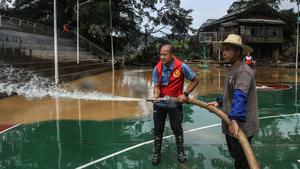 (250626) — LIUZHOU, 26 junio, 2025 (Xinhua) — Un aldeano y un voluntario limpian limo, en la aldea de Liangkou del distrito autónomo dong de Sanjiang, en la región autónoma zhuang de Guangxi, en el sur de China, el 26 de junio de 2025. Las autoridades locales refuerzan las labores de control de inundaciones y restauración tras días de lluvias torrenciales que provocaron inundaciones aquí. (Xinhua/Zhang Ailin) (jg) (da) (vf)